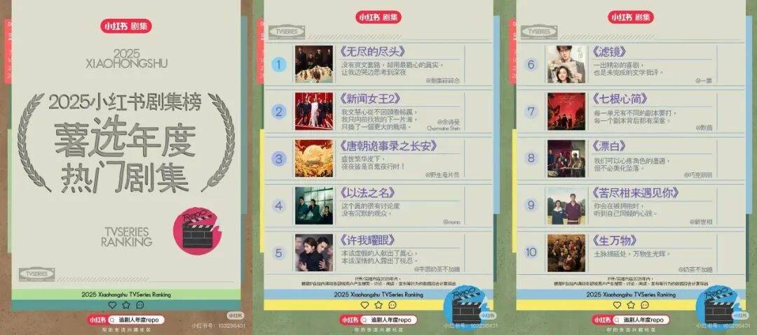 同样地,《生万物》的追剧repo活动拿下了2025年小红书暑期话题浏览量TOP1,活动期间话题浏览量破20亿,参与追剧人数超过284万,衍生出超过3500篇的过百评笔记。在小红书,用户的每一次点赞、收藏、评论与创作,都是一场给剧集的“投票”。