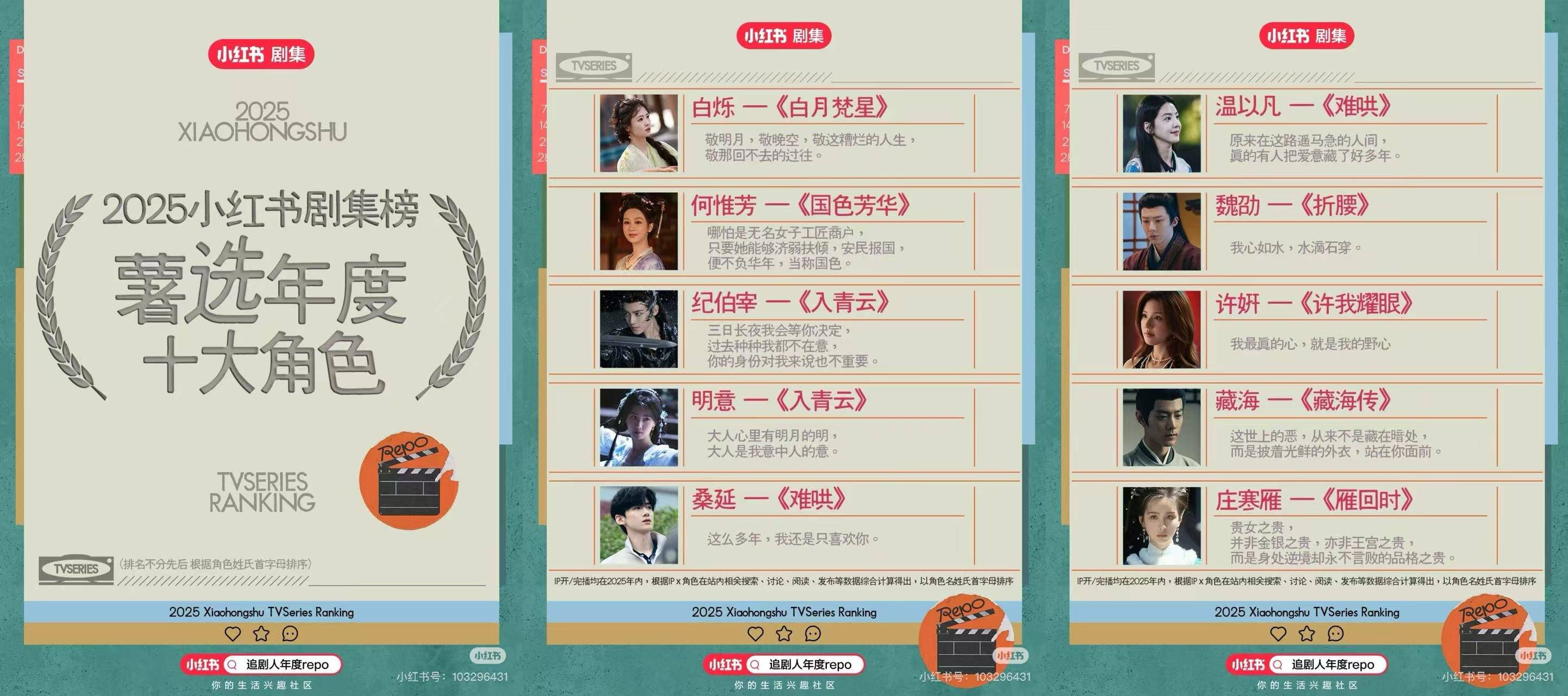 为了让这种变化更清晰可见,小红书也通过剧集榜单将这种趋势结构化呈现。榜单用三个维度呈现了真实口碑讨论的分布图景与生长轨迹,“薯选剧集榜”反映了剧集真实讨论热度与口碑;“破圈剧集榜”对应剧集内容在多元化的兴趣社群里自然发酵的可能性;“角色榜”验证有哪些人物真正“活”出了剧集周期。
