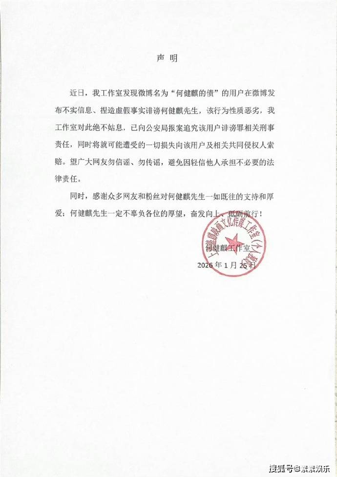 何健麒工作室:近日,我工作室发现了一些不实的信息,捏造虚假事实诽谤何健麒先生,该行为性质恶劣,我们工作室绝不姑息,已向公安报案。