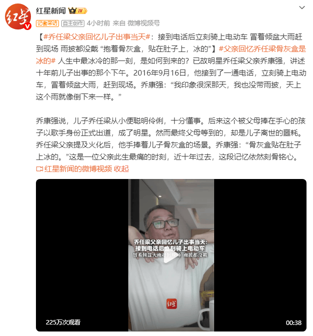 乔康强说,儿子乔任梁从小便聪明伶俐,十分懂事。后来这个被父母捧在手心的孩子以歌手身份正式出道,成了明星。然而最终父母等到的,却是儿子离世的噩耗。乔任梁父亲提及火化后,他手捧着儿子骨灰盒的场景。乔康强:“骨灰盒贴在肚子上冰的。”这是一位父亲此生最痛的时刻,近十年过去,这段记忆依然刻骨铭心。