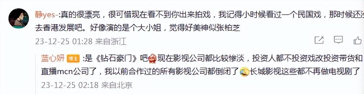 蓝心妍回复那是《钻石豪门》,她透露:“现在影视公司都比较惨淡,投资人都不投资戏改投资带货和直播mcn公司了,我以前合作过的所有影视公司都倒闭了!长城影视这些都不再做电视剧了!”