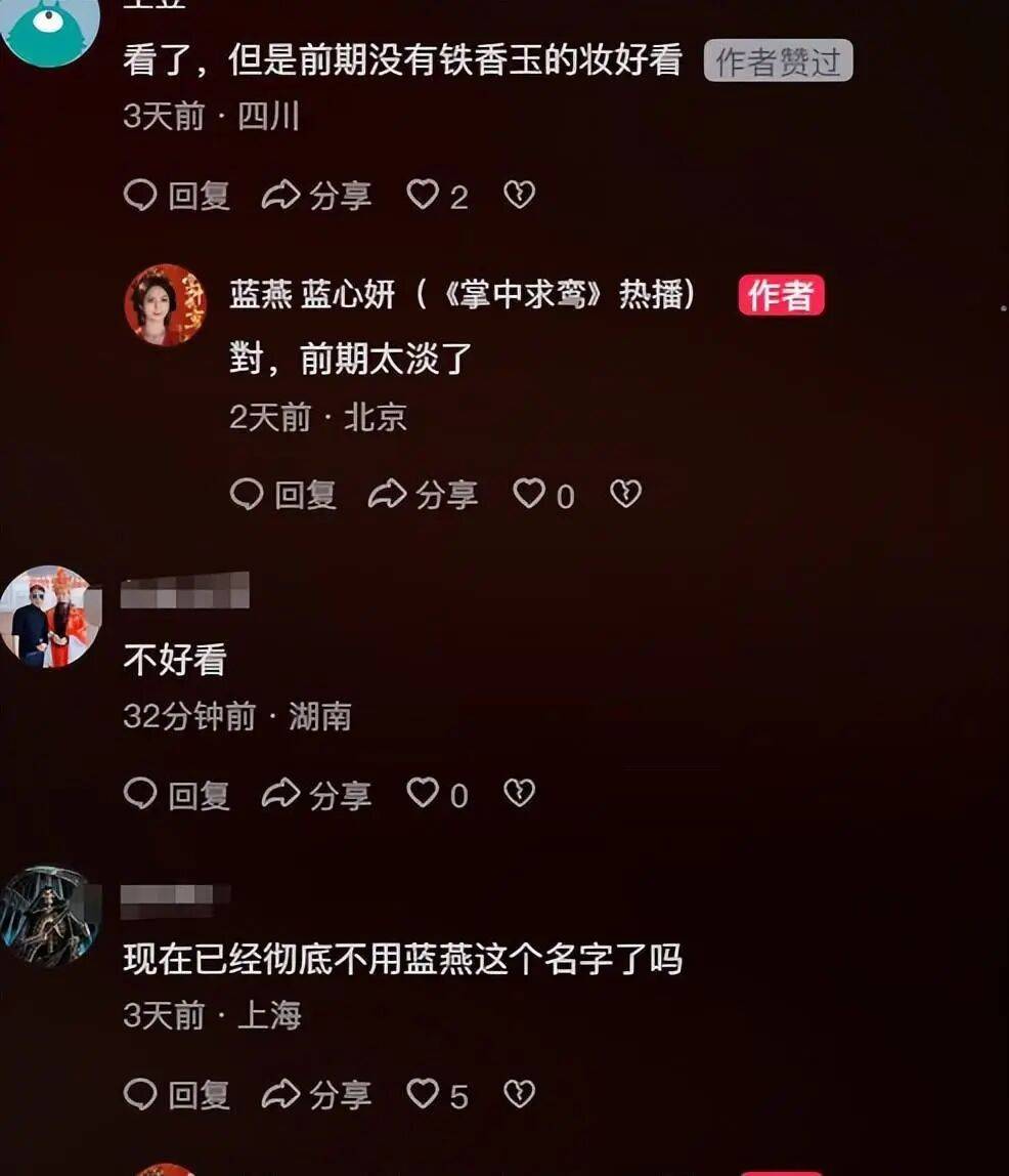 不过,蓝心妍也跟网友们积极互动,有人叹息前期没有铁玉香的妆好看,蓝心妍表示前期的妆太淡了!