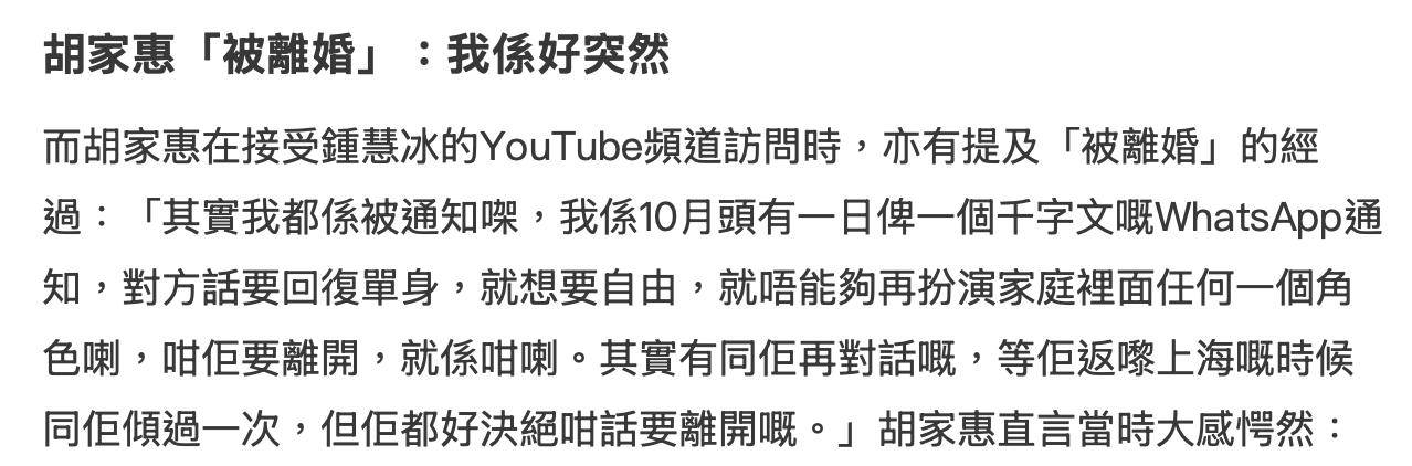 胡家恵在2025年11月突然宣布与第二任丈夫离婚,结束三年的婚姻,事发突然,连她自己都感到愕然。她在受访的时候称,在2025年10月初就收到第二任前夫的信息,对方称照顾胡家恵母女的任务已经完成,现在需要下车,想要自由去追寻个人的理想,不能再在现有的家庭中扮演任何角色。胡家恵当时还觉得对方是不是因为工作压力过大,想要宣泄一下情感,还想着等对方回来之后好好倾谈一下,也许有转机。结果两人在详谈之后发现根本无法解决问题,对方执意要离婚,胡家恵也就没再挽留。