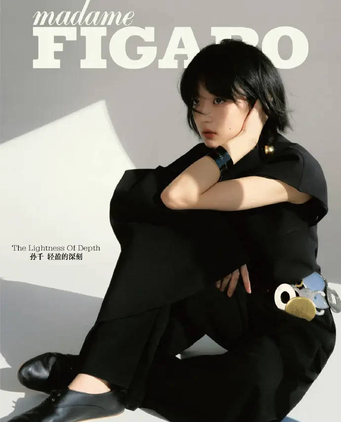 孙千一身全黑造型,腰间金属配饰点缀,气质清冷。
