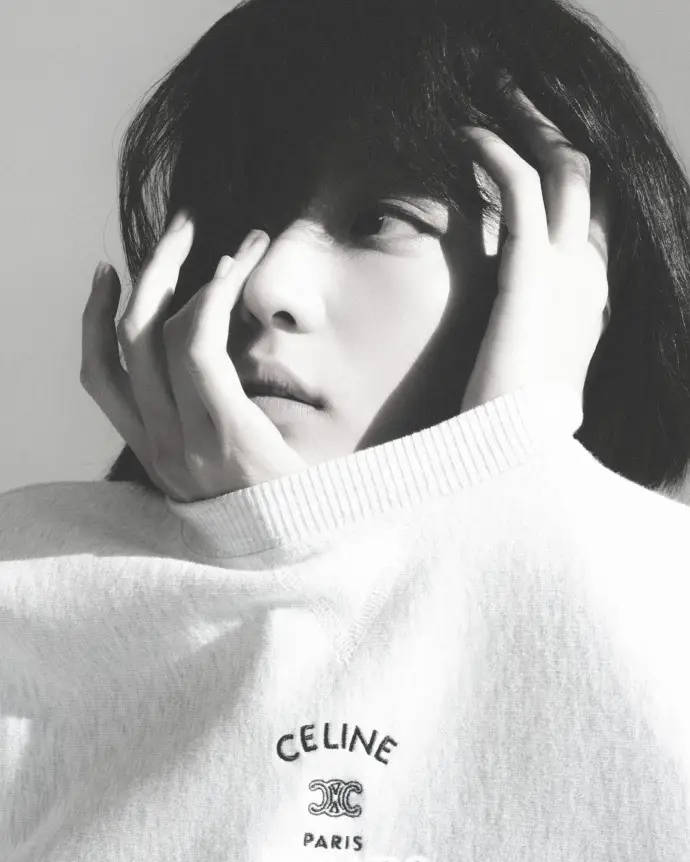 孙千着高领毛衣托腮遮半脸,眼神疏离又充满故事感。
