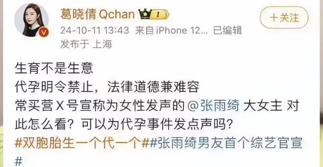 去年葛晓倩就晒出过一系列张雨绮dai孕的证据,包括dai孕的合同细则,以及张雨绮双胞胎孩子上学的相关细节,这确实在很大程度上锤了张雨绮当年生一个代一个,结果两个孩子没能如愿同步出生,女儿比儿子小几个月这事。