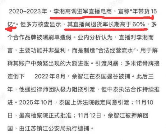 李湘近几年频繁注销的公司,主打一个快设快撤,刚好也是地下钱庄洗钱的套路,就连她搞的直播带货,宣称是年带货15亿,实际退货率超60%,也被怀疑是打着带货的名义,制造虚假的合法经营流水,让黑钱洗白。