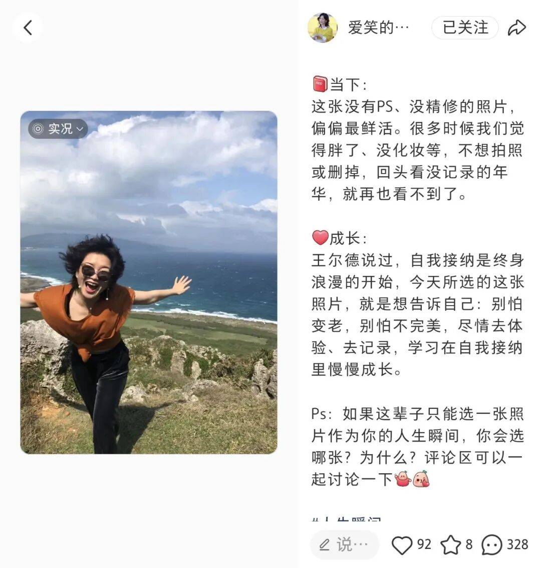 她社交媒体里的衣着、化妆、美颜都用力过猛,她似乎努着劲要走上一条叫做“精致女生”的赛道,要塑造自己虽然老了却依然云淡风轻、接受并且享受衰老的、优雅从容淡定的大女主形象。