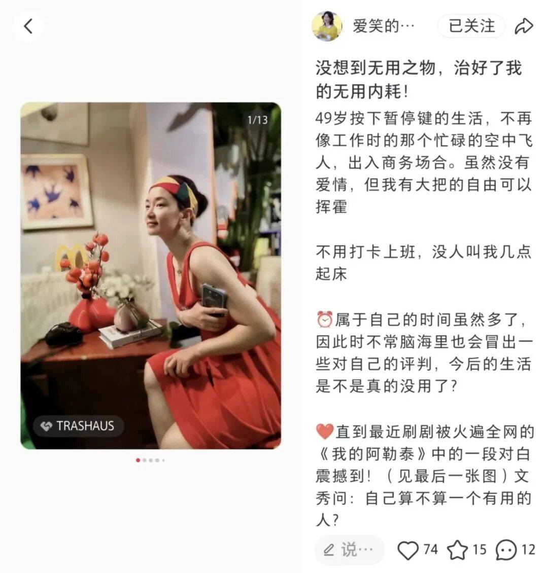 小红书拍视频展现的生活状态,是岁月静好的精致老女生,表达自己享受五十岁、单身、退休的孤独状态。上了节目讲前半生时,说离婚是一个女人最大的失败,凄凄惨惨说自己过年都出去玩,不敢在家,因为害怕面对一个人的孤独。