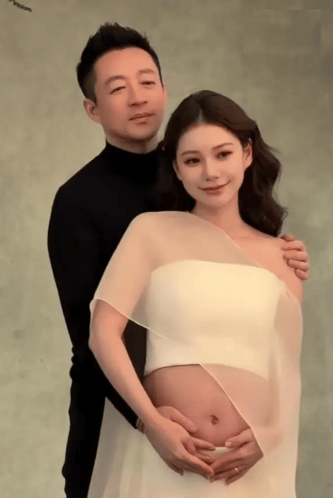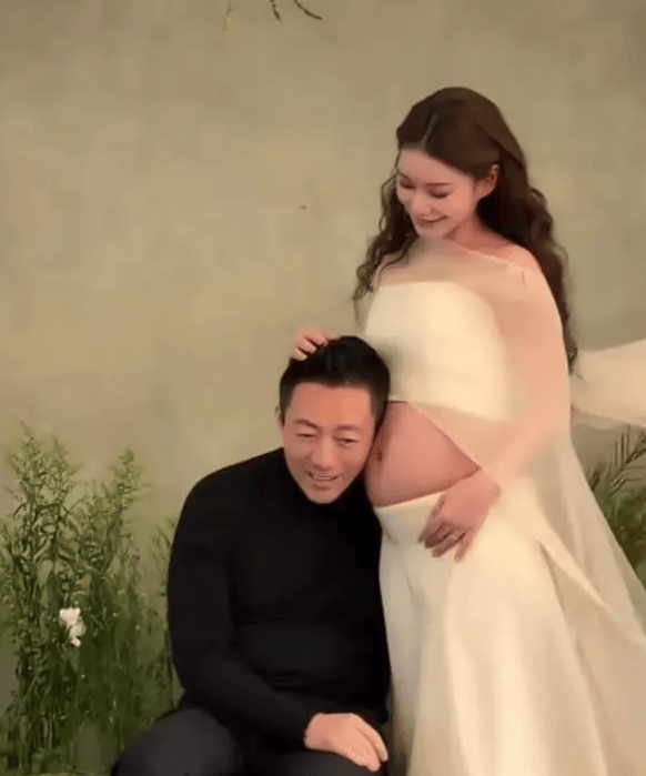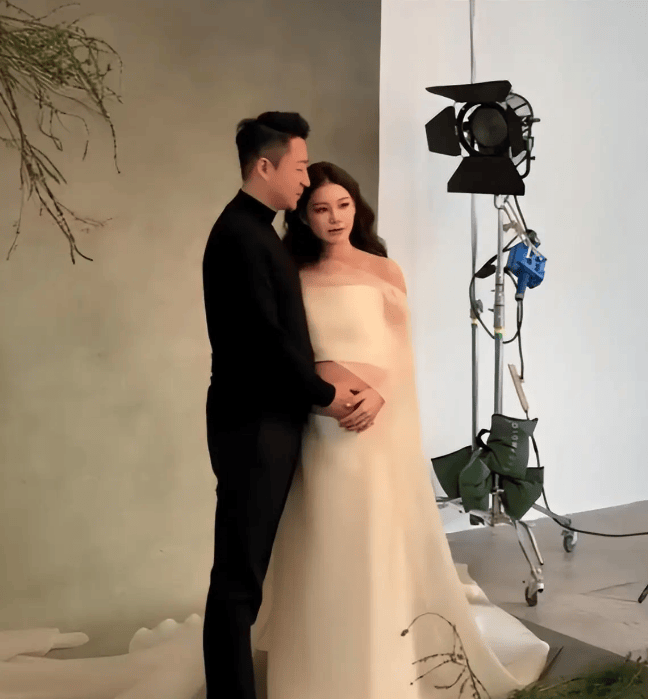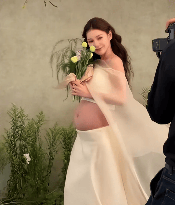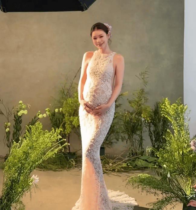 马筱梅穿白色纱裙露出孕肚。