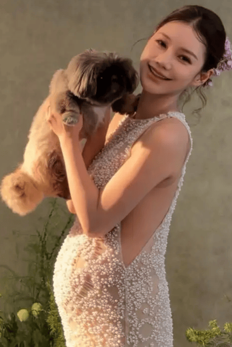 马筱梅抱着小狗笑容很甜。