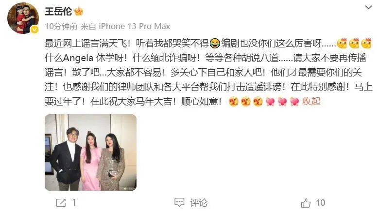 王岳伦的回应,带着他惯有的、似乎总慢半拍的文风:“最近网上谣言满天飞!听着我都哭笑不得……什么Angela休学呀!什么缅北诈骗呀!等等各种胡说八道……请大家不要再传播谣言!”