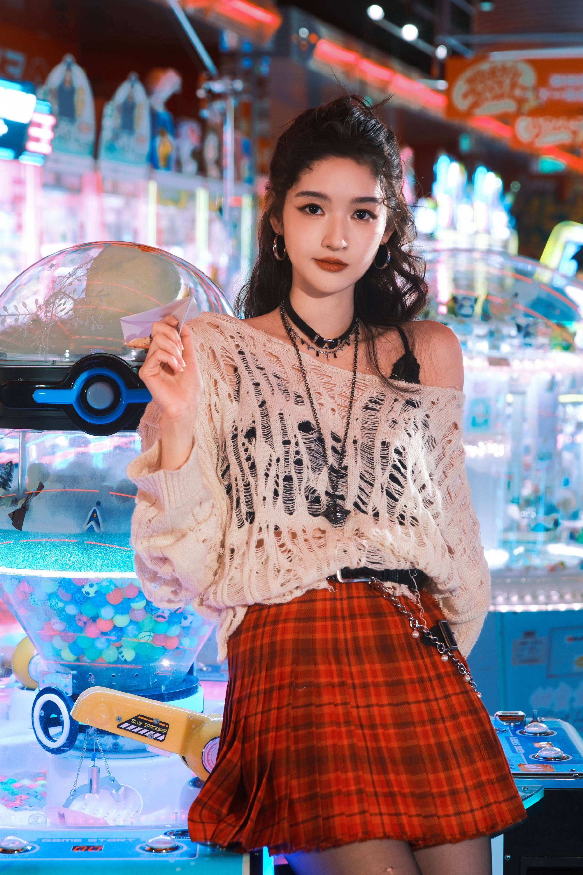 王玉雯米白镂空毛衣搭红格短裙,元气又甜酷。