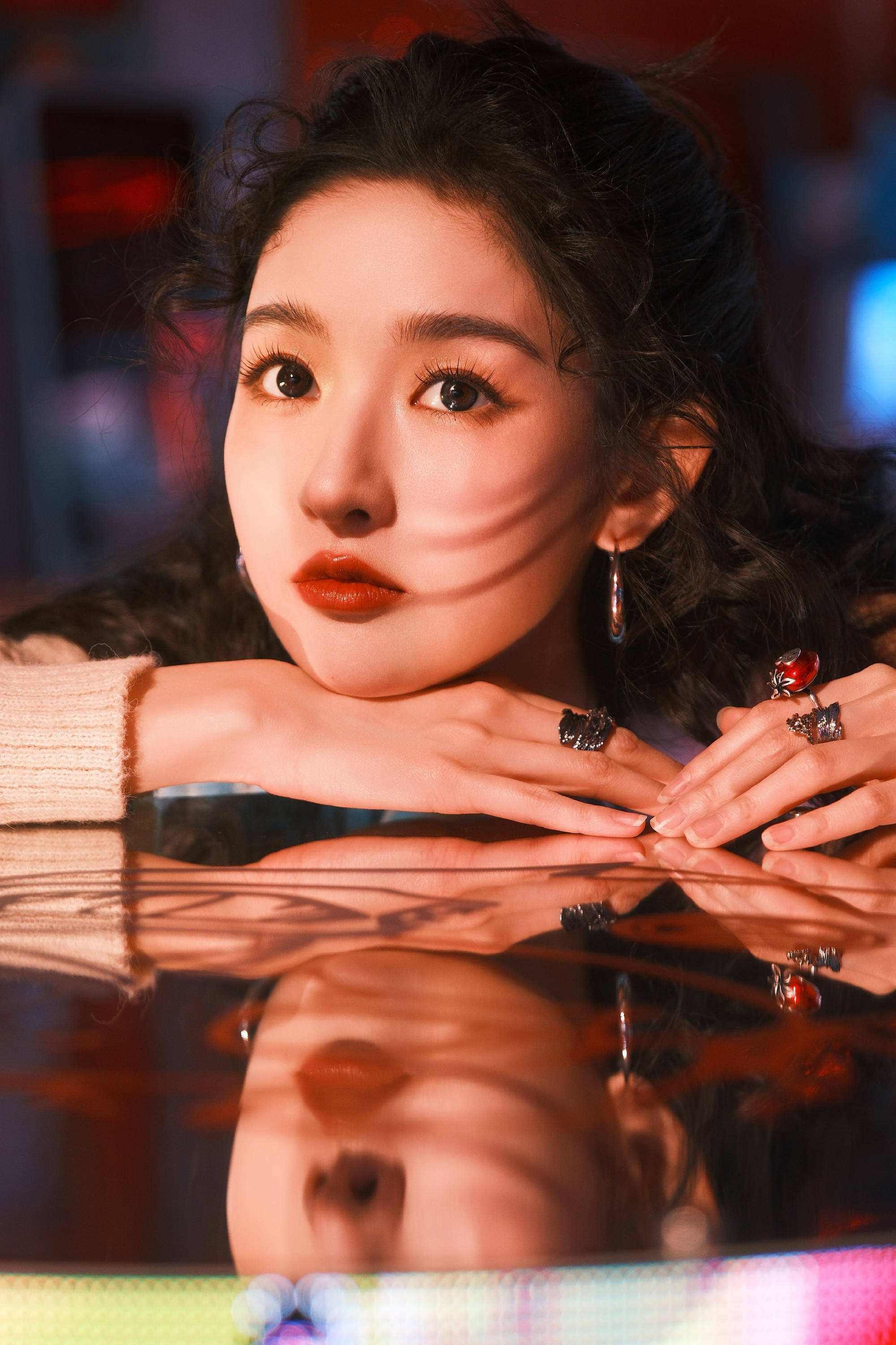 王玉雯伏在反光台面,光影在脸上流转,清冷魅惑。