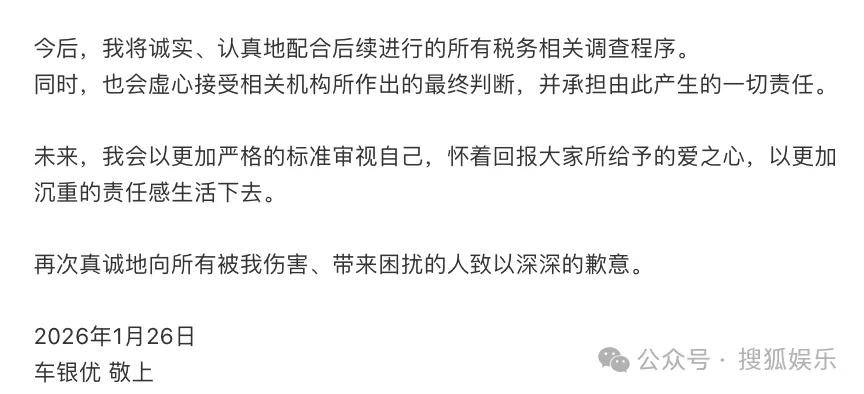 直到1月26日晚上,车银优突然配上一张全黑图片,发布了一封格式工整、语气沉重的亲笔信。