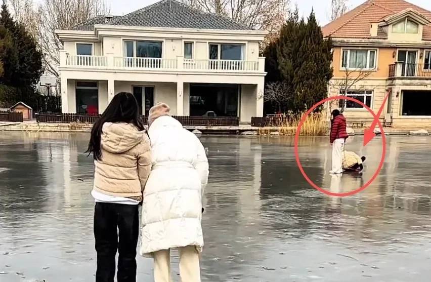 帅气的孙子小箖箖在远处的冰面上摔倒了,这边的奶奶张兰仍然在鼓励着他,不见她立刻上前帮忙。