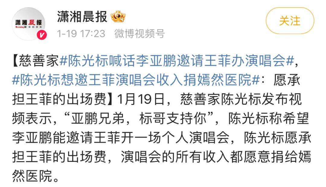 1月19日,以高调做慈善闻名的企业家陈光标,向李亚鹏隔空喊话,提出一个极具话题性的建议:希望李亚鹏能邀请王菲举办一场个人演唱会,出场费由陈光标来承担,所有收入将捐赠给嫣然医院。