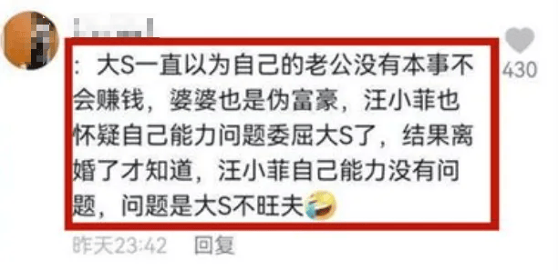 刚刚经历过流产之痛,就陪着汪小菲上综艺挣钱的大S,在结婚时被骂拜金,离婚后汪小菲的事业有所起色,她还要被追加一句“没有旺夫命”的恶评。