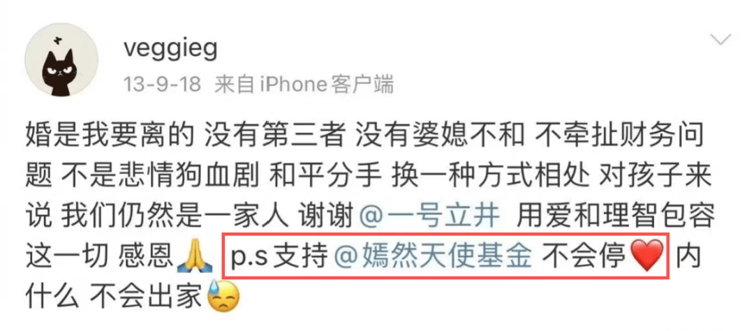 她亲自为嫣然基金创作了主题曲《爱笑的天使》;在活跃于微博的那些年里,她频繁转发嫣然相关内容;甚至在和李亚鹏官宣离婚时,她也会特意补充一条声明,强调婚姻的结束不会影响她对嫣然的支持。