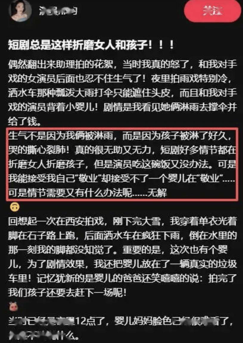 还有的短剧片场,因为婴儿不配合哭闹,导演就商量说掐孩子一把,虽然视频的配文是妈妈心疼舍不得,但最后的解决方式会如何,我们都心知肚明。