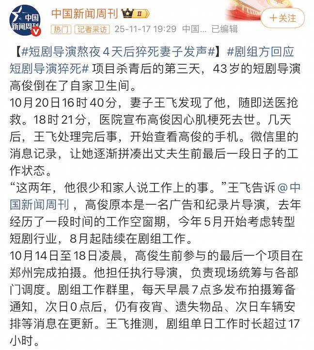 2025年底,短剧圈曾有过一条这样的新闻。一位短剧导演在连续多日每天工作超过17小时后,在家中突发心梗离世。