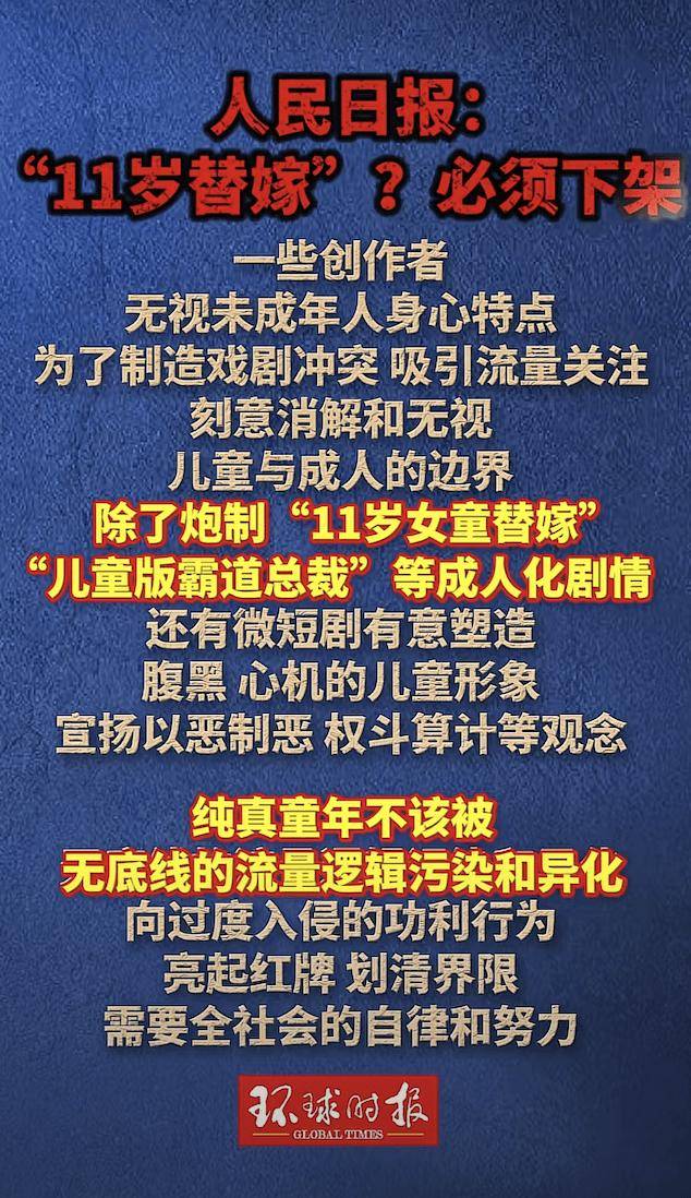 剧中,一名11岁的女孩身穿嫁衣,饰演替嫁新娘。剧情中包含七岁出嫁、十五岁抱娃等吸睛设定。虽然打着“重生”“甜宠”的标签,但其情节中隐含的养成系、早婚、圆房等成人化隐喻,已明显触碰了道德伦理的红线。
