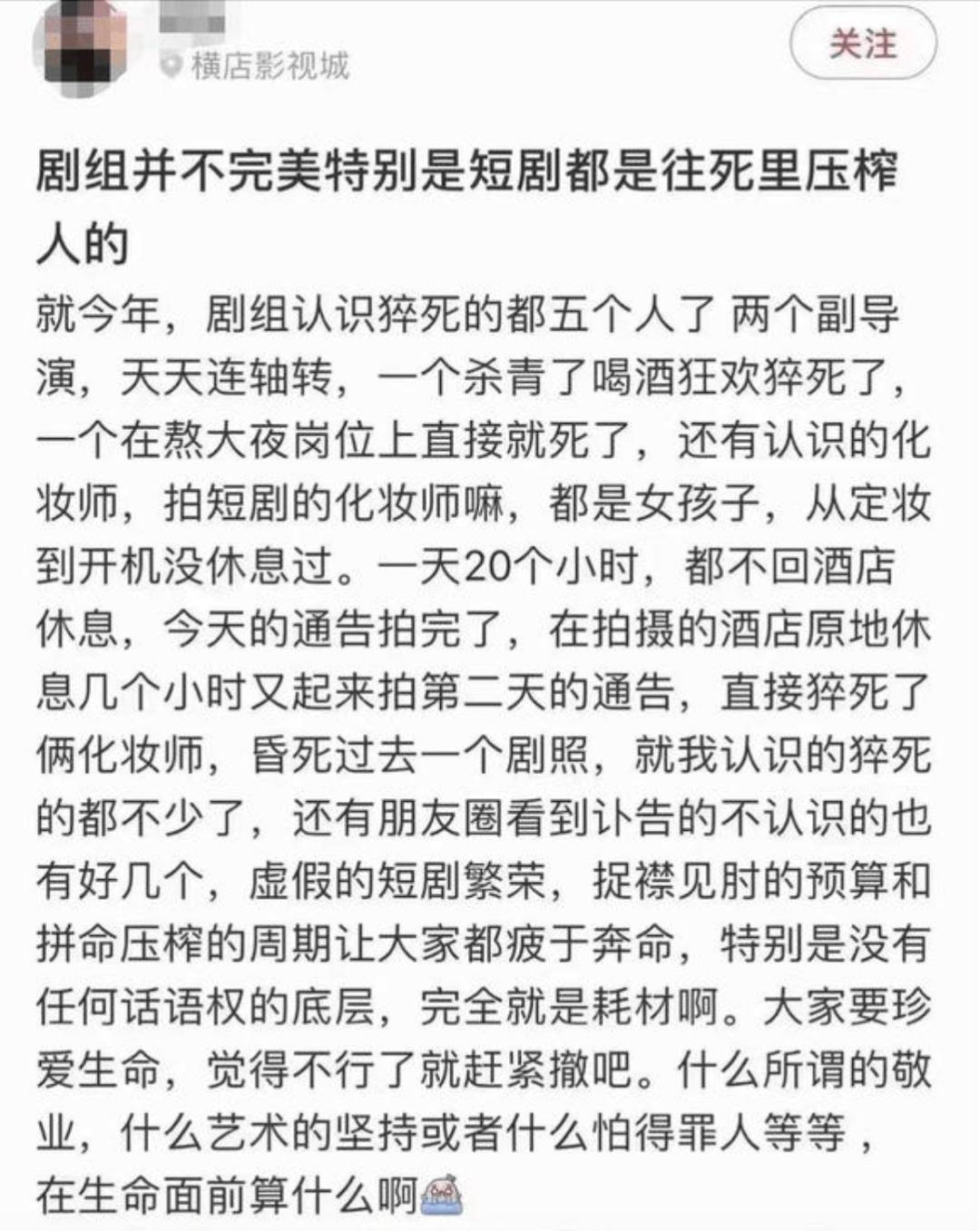 这种高压和连轴转,直接摧残着从业者的身心健康。在社交平台上也有自称独立演员的网友爆料,“短剧剧组都是往死里压榨人的”。他所在的剧组圈子,仅当年听说的,因过劳或相关原因猝死的同行就已高达5人:有在杀青庆祝时因过度饮酒身亡的,也有直接在岗位上因熬夜猝死的。