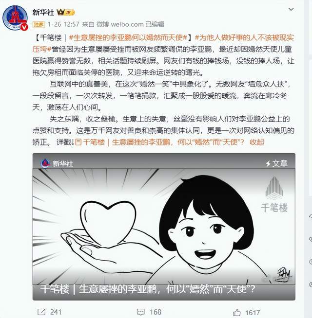也许是基于这样的考虑,新华社从另外一个层面切入,不提他生意的失败,也不提他感情生活的破损,而是从“坚持公益”出发,并用“失之东隅,收之桑榆”来总结这次发生的事情。