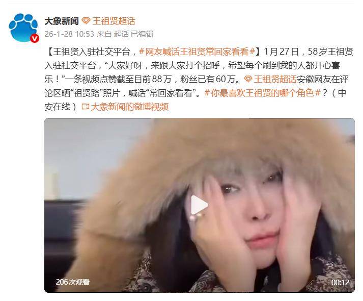 一条视频,一句“你猜”,让沉寂许久的娱乐圈瞬间沸腾。据1月28日报道,1月27日,一代银幕女神王祖贤突然入驻国内短视频平台,瞬间引爆全网。没有预告,没有宣传,仅凭一条素颜出镜的问候视频,24小时内点赞量便突破80万,粉丝数飙升至数十万,这波“回忆杀”的威力堪称核弹级别。