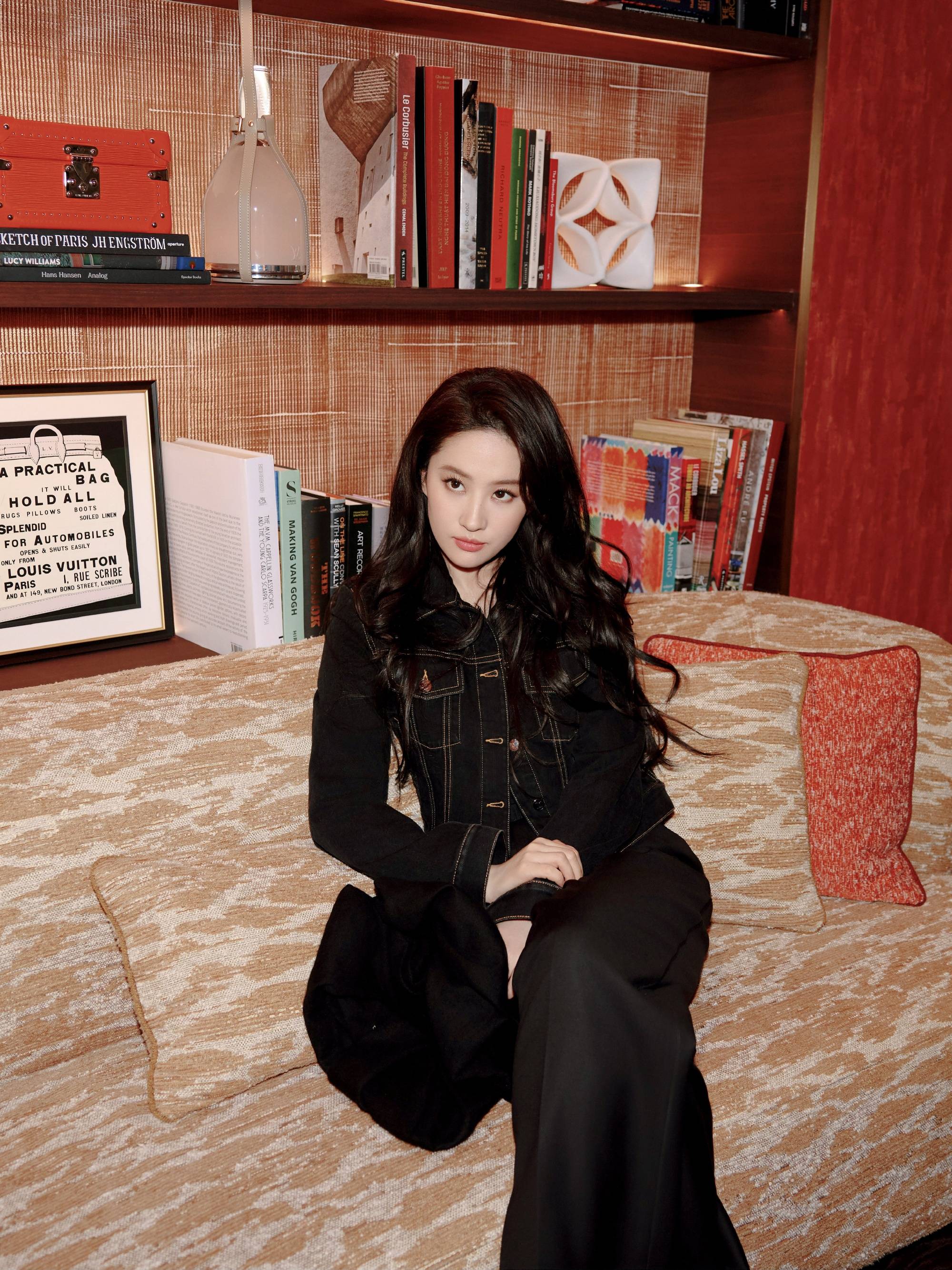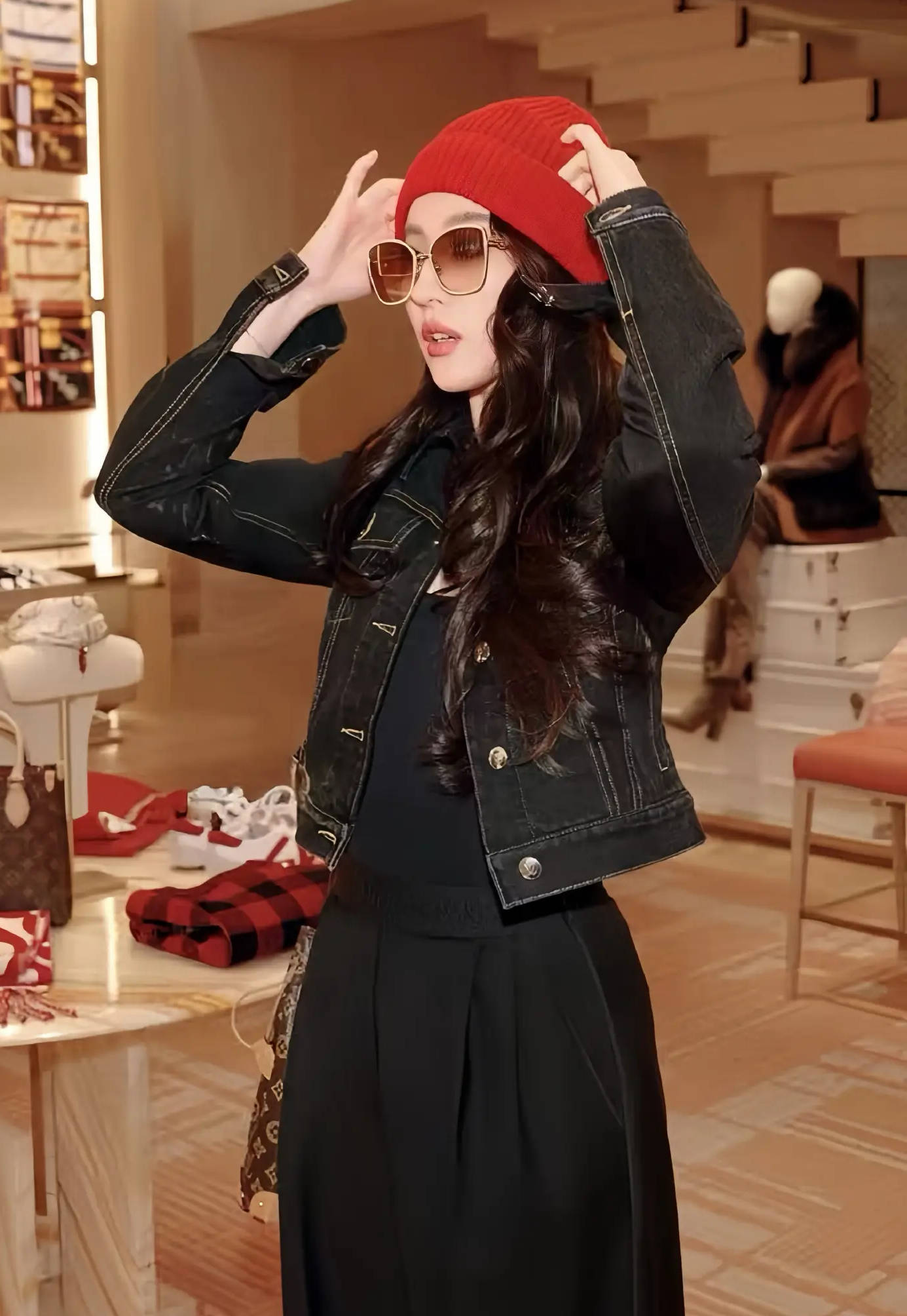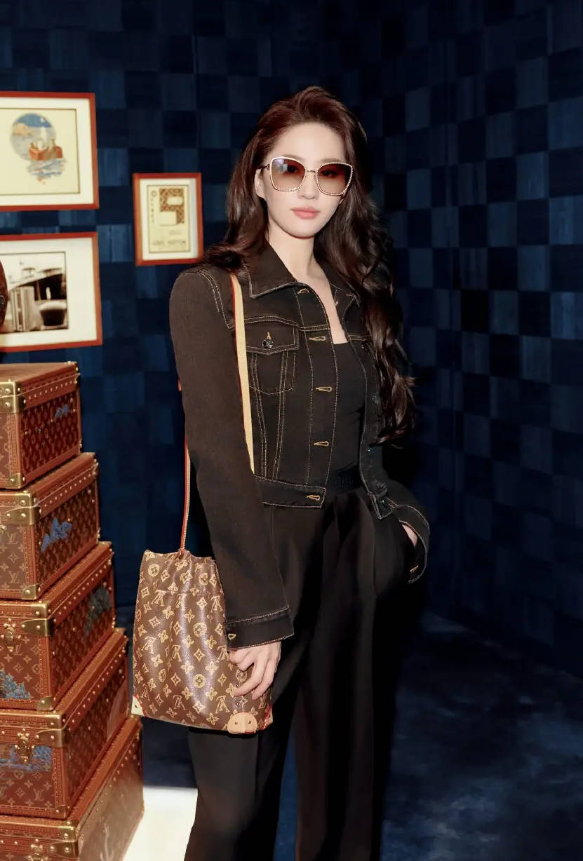 她身穿牛仔外套搭配黑色长裤,造型时髦干练。