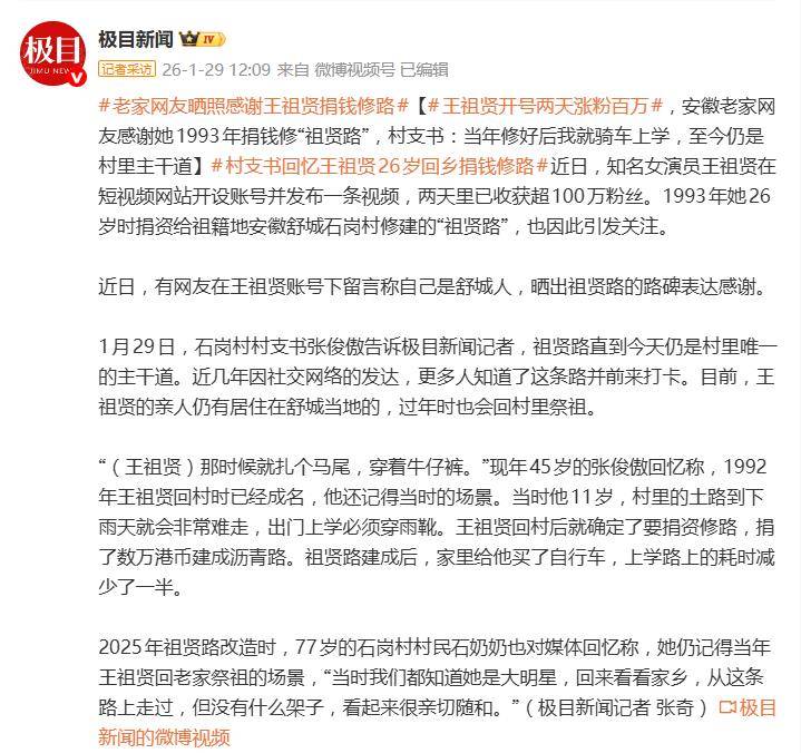 这波“回忆杀”来得猝不及防。评论区瞬间变成大型“考古”现场,聂小倩的剧照、白素贞的经典镜头被反复刷屏。然而,真正将这场网络怀旧推向高潮的,是一条来自安徽舒城网友晒出的“祖贤路”路碑照片,并配文致谢。这张照片获得了惊人的11万点赞,也意外揭开了这位息影女星一段尘封近三十年的往事。