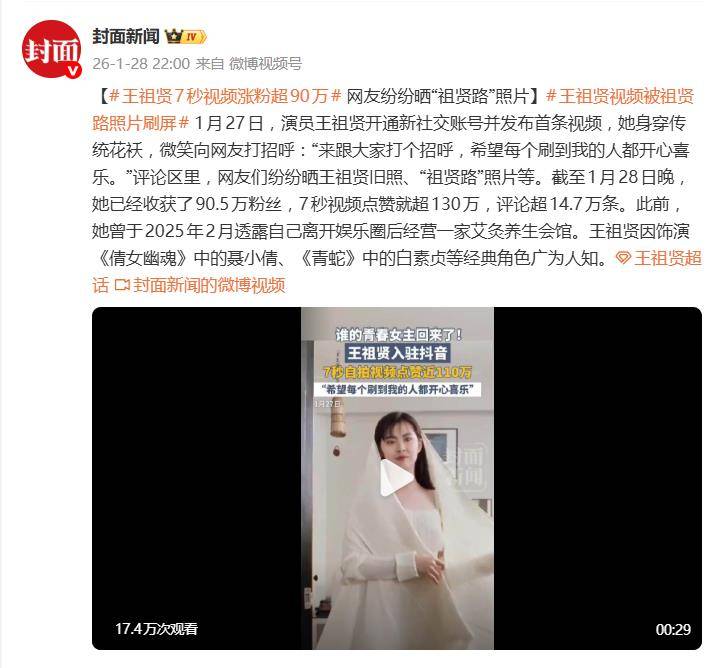 1月27日,一条仅有7秒的视频在网络上炸开了锅。视频里,58岁的王祖贤身穿传统花袄,素面朝天,对着镜头微微一笑,轻声问候:“希望每个刷到我的人都开心喜乐。”没有台词,没有滤镜,更没有精心设计的桥段。就是这样一个简单到极致的招呼,在发布两天后,竟让她新开的社交账号粉丝数狂飙超过90万,视频点赞突破130万,评论近15万条。
