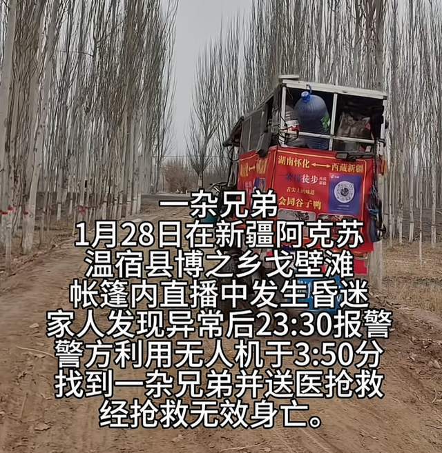 当天,一杂哥是从新疆返回会同老家,并在阿克苏温宿县博之乡戈壁滩,夜晚来临的时候,他则在帐篷内直播,期间晕倒去世,家人通过直播发现之后,迅速联系当地警方,经过几个小时的寻找,虽然最终找到,但却因为抢救时间等原因不幸去世。