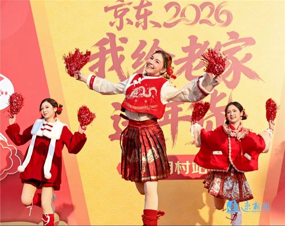 随后,京东青春采销主播登场,带来歌舞表演《欢乐中国年》。演员们身着红色旗袍,头上挽着俏皮的双发髻,身姿曼妙、笑容明媚,将现场的喜庆氛围推向一个小高潮。紧接着,极具乡土韵味与国风美感的《丰收渔鼓》缓缓上演,欢快悠扬的旋律萦绕耳畔,演员们手持渔鼓轻轻敲击,鼓点清脆、身姿舒展,脸上始终洋溢着幸福灿烂的笑容。