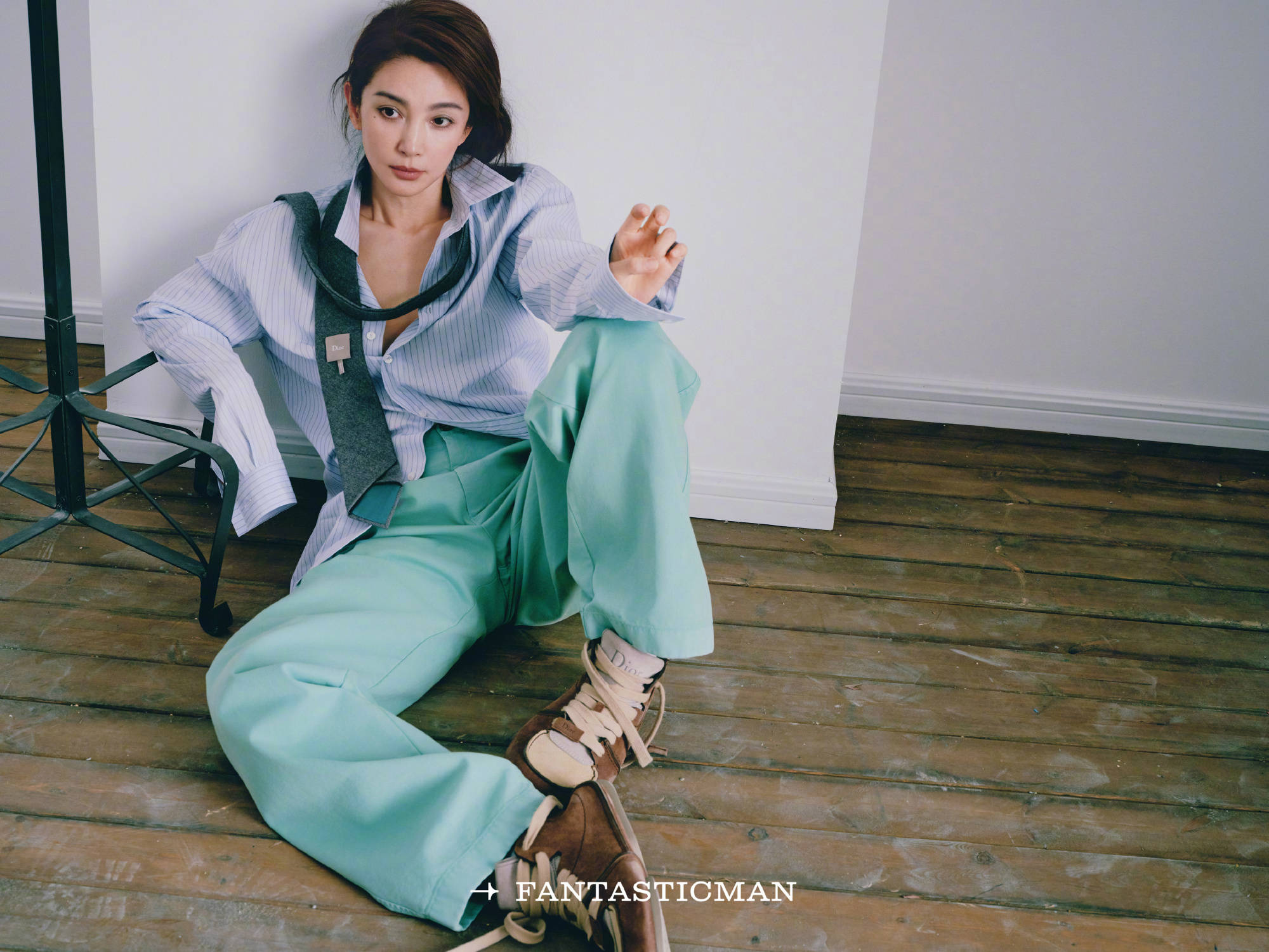 李冰冰坐于地板,神态松弛随性。