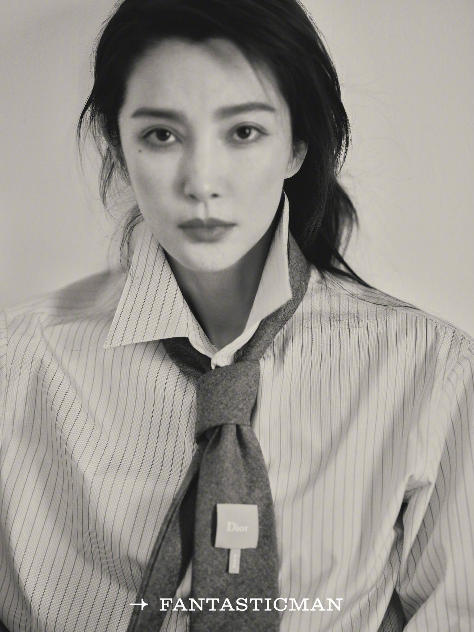 李冰冰黑白特写,条纹衬衫配领带干练冷艳。