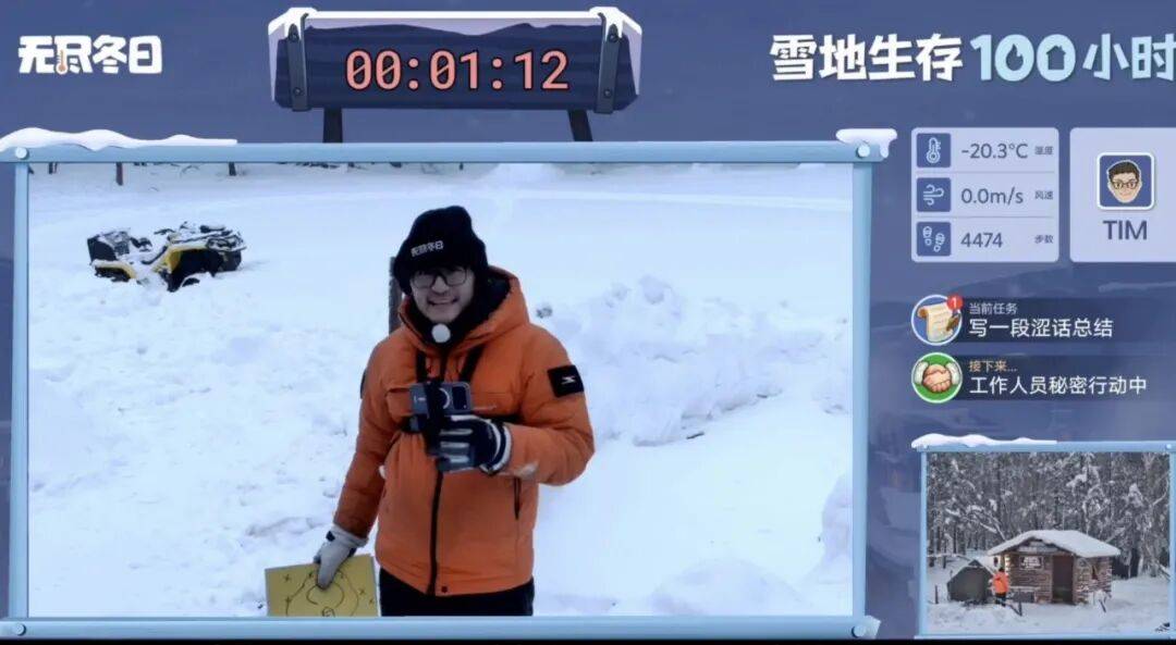 换言之,观众不仅是在看Tim能否熬过严寒,同时是随时等待下一次规则判定、下一次翻车或反转,这跟过去综艺里经常看到的「任务-失败-惩罚-补救」叙事结构高度相似,况且实时直播0剪辑的特性更为节目增添了高度互动性和悬疑刺激感。