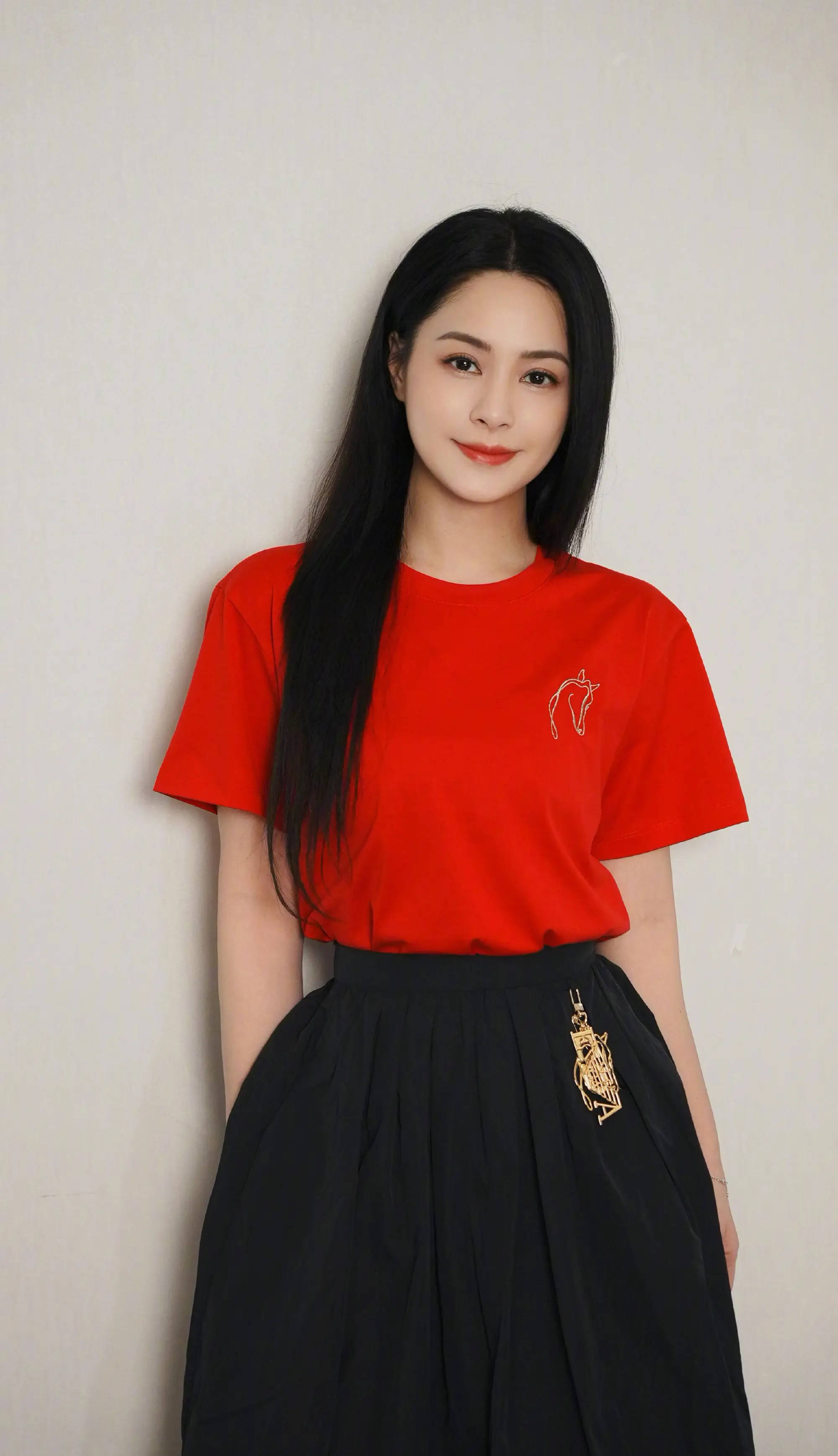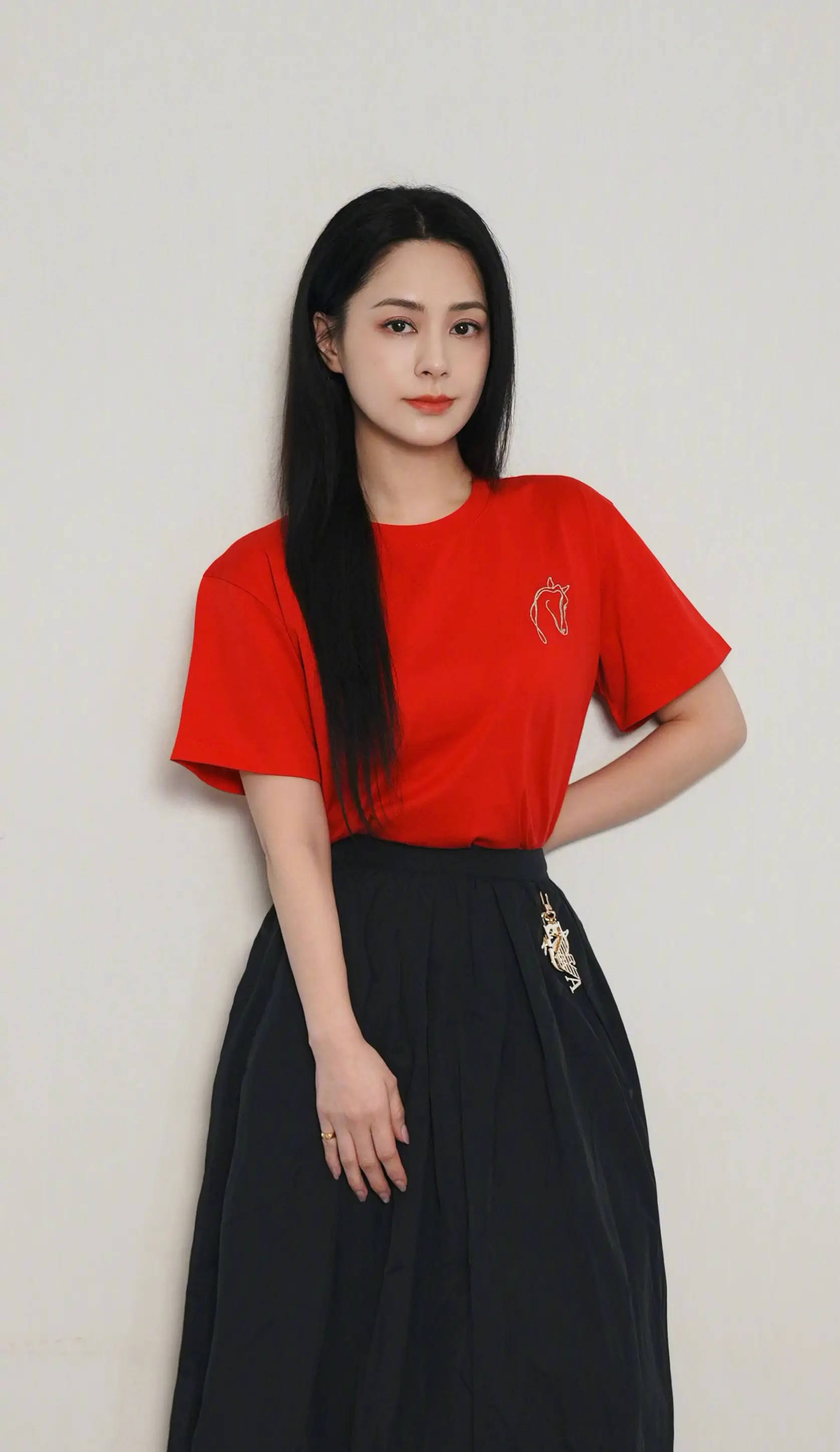 阿娇穿上红色T恤拍照,十分明媚动人。