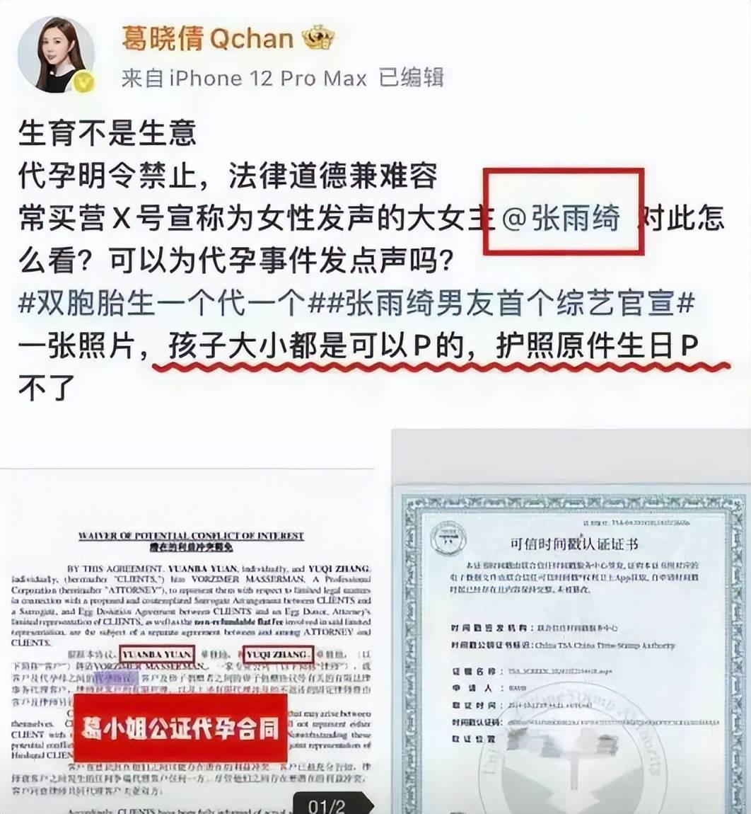 更为严重的是,葛晓倩还进一步曝光说,张雨绮的两个双胞胎子女疑似是代孕所生,还拿出了一份经过公证的护照信息。