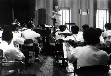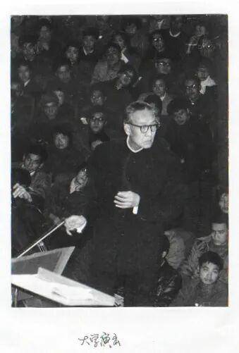从1980年暑假开始,在黄贻钧(上图)的带领下,上海交响乐团除了在正式的剧场里安排普及音乐会,还跑了好多大中学校(下图)。1981年2月25日,在上海师范大学,黄贻钧亲自向同学们一首首地介绍作品。也就在那一天,新华社说,在一年不到的时间里,上海交响乐团跑了27所大中学校。1982年8月28日《文汇报》记录,乐团连续举办了26场《世界名曲音乐会》,场场座无虚席,创造了交响乐专场演出的最高纪录。
