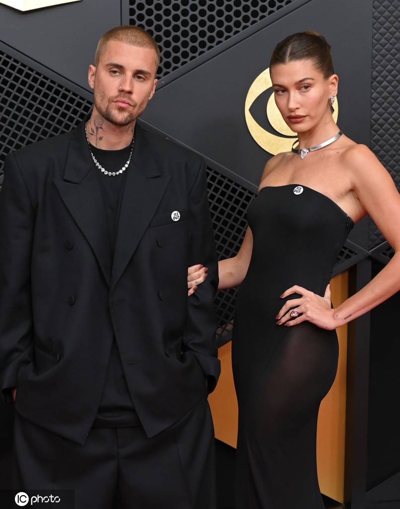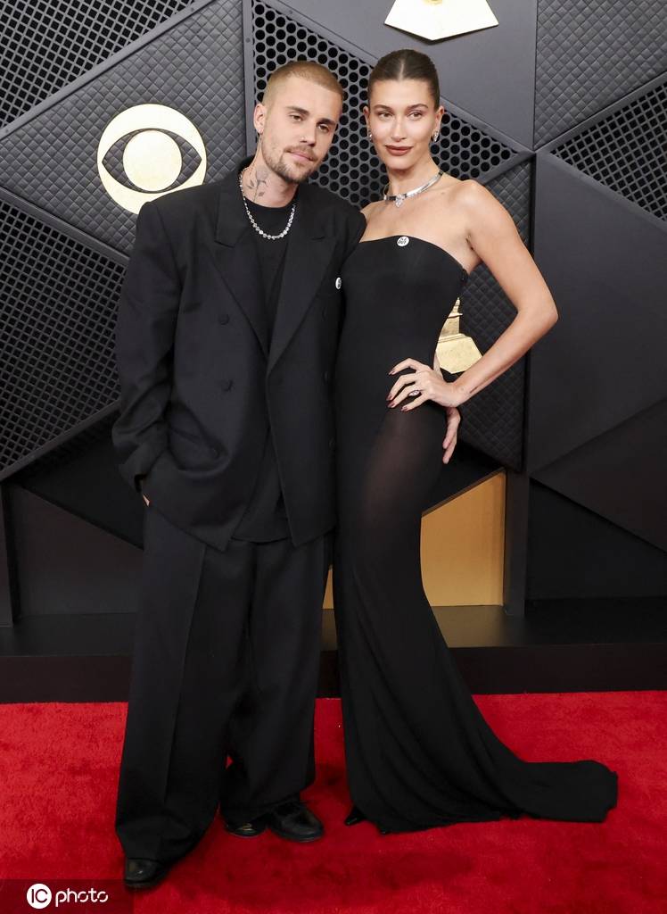 当地时间2026年2月1日,美国加州洛杉矶,贾斯汀·比伯和海莉·比伯夫妇亮相第68届格莱美颁奖典礼红毯。