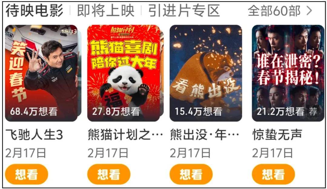 《飞驰人生3》、《惊蛰无声》、《熊猫计划之部落奇遇记》、《镖人:风起大漠》属于第一档,全员投资大、明星多、票房野心高,一个个坐二望一,争夺春节档票房冠军;