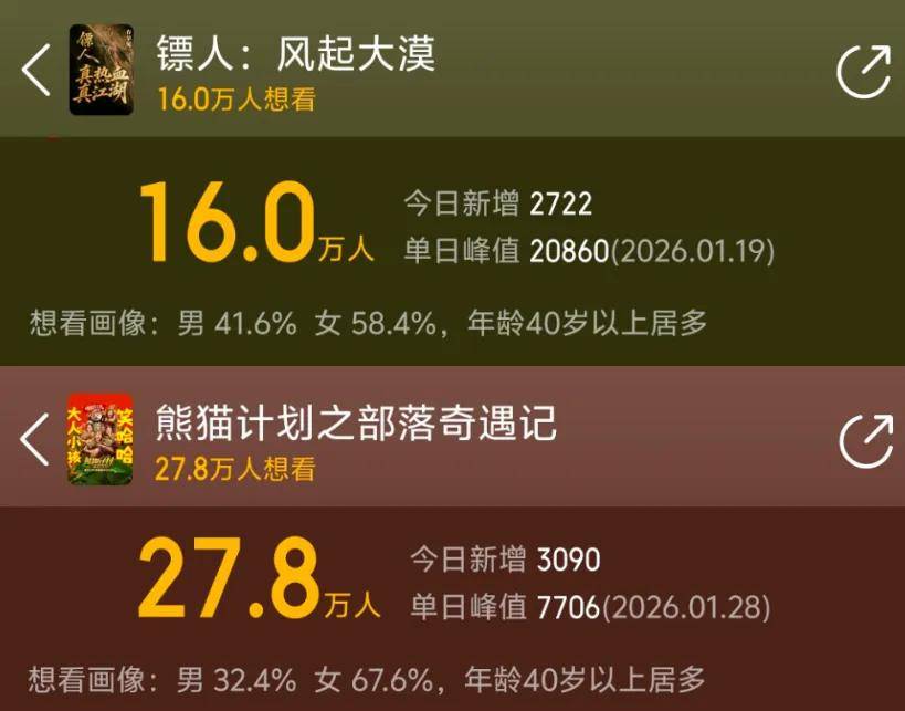 还有一个细节挺有意思的,2026年春节档7部电影,其中5部的受众画像都在20~24岁,唯有《熊猫计划》和《镖人》,受众画像在40岁以上。