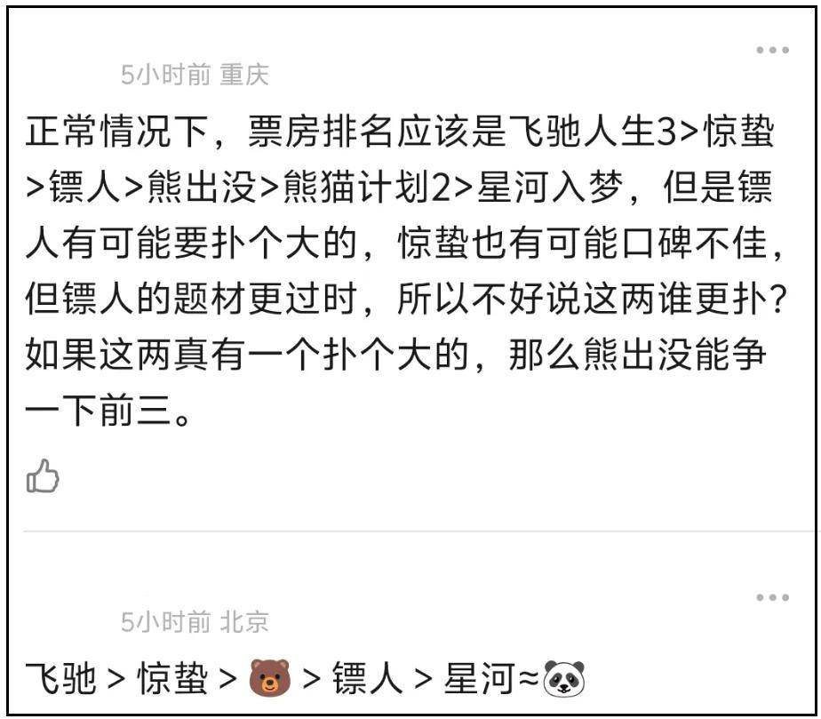 《熊出没》系列动画电影一向是春节档票房守门员,出场就自带宣发;《重返狼群》是重映纪录片,还是初三上映,相当于春节档打酱油的路人甲;《星河入梦》是典型粉丝电影,票房成绩如何,要看主演王鹤棣和宋茜粉丝的实力。