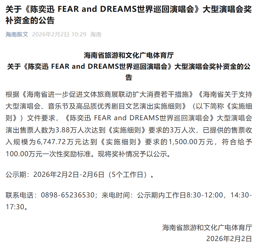 据公告,根据海南相关文件要求,《陈奕迅 FEAR and DREAMS世界巡回演唱会》大型演唱会演出售票人数为3.88万人次达到《实施细则》要求的3万人次,已提供的售票收入规模为6,747.72万元达到《实施细则》要求的1,500.00万元, 符合给予100.00万元一次性奖励标准。现将奖补情况予以公示。