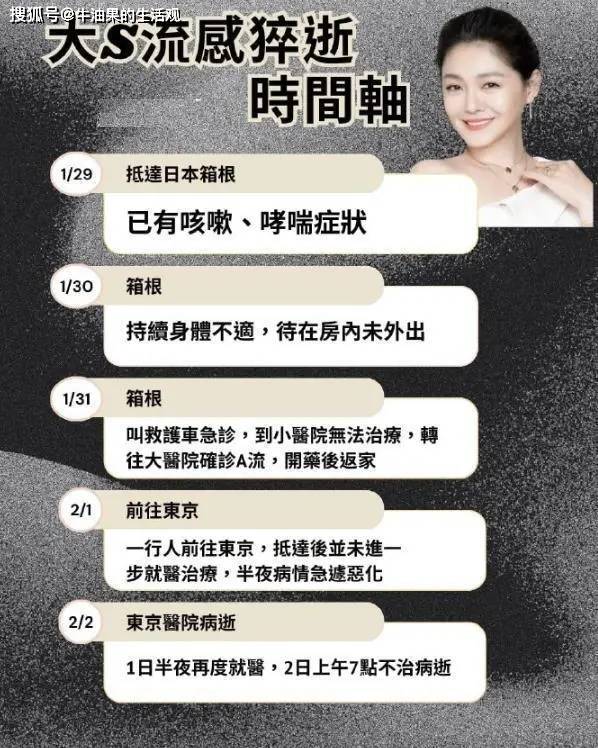 大S不想在异国就医,于是买了返程机票,没想到心脏骤停就近抢救14个小时,最终因为败血症离世。