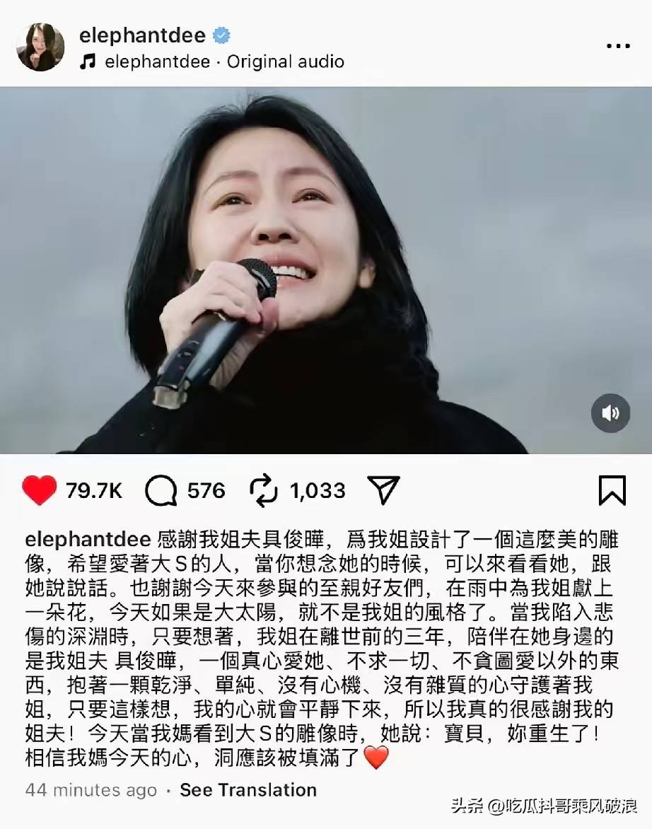 大S的周年祭,原本是家人和亲友们悼念她的时刻,然而看如今的情形,反而变成了具俊晔的秀场,他的亮相成了唯一的焦点,雕像揭幕礼成了他自己情感表演的舞台。 具俊晔一边声称我很爱很爱大S,一边却在揭幕礼上用雨伞的尖端去撩动盖在大S雕像上的粉色雨布,那一幕,仿佛是他对大S感情的某种表现,但却让人难以理解。