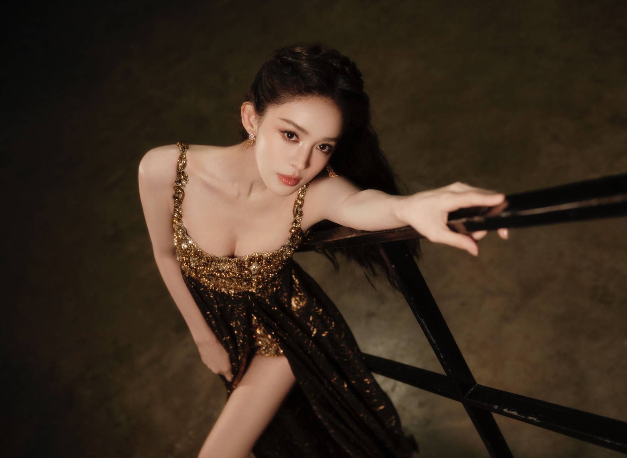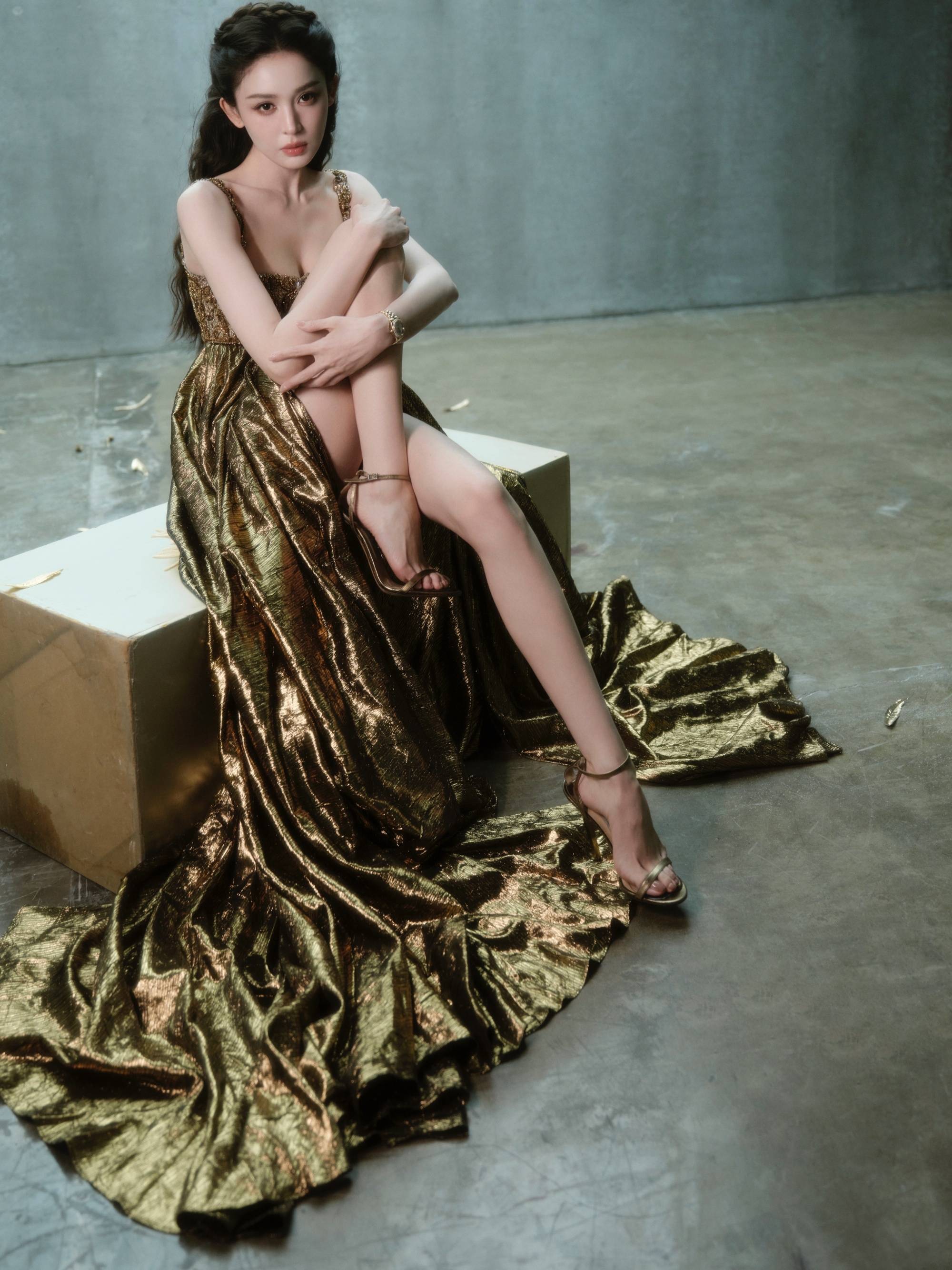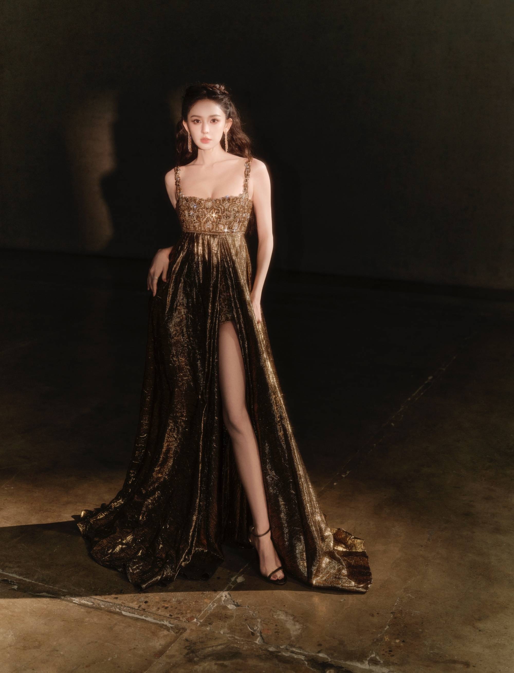 娜扎倚黑梯凝望,鎏金裙身冷艳魅惑。