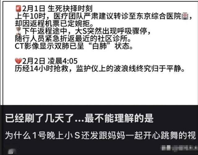 S家作为至亲,没有一人劝阻,反而顺从了她的意愿,紧急订购返台机票,最终导致大S在前往机场的途中,突发心脏骤停,错过了最后的抢救机会。