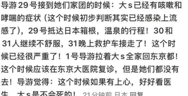 2025年1月29日,小S组织全家前往日本旅行,大S出发前就已出现咳嗽、发烧等不适症状,但出于不想打扰家人的想法,她选择了忍受,踏上了旅程。